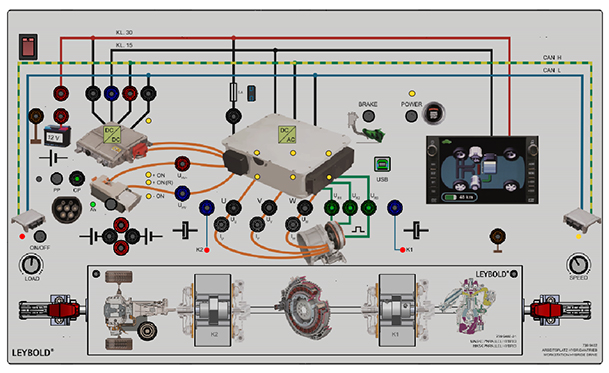 The workstation includes a hybrid engine with rotor position sensor, a (surrogate) combustion engine as well as a propulsion unit (combining gears, roll resistance of the tires and air resistance) in 24 V technology as parallel hybrid.