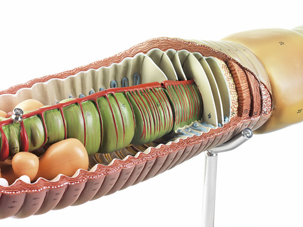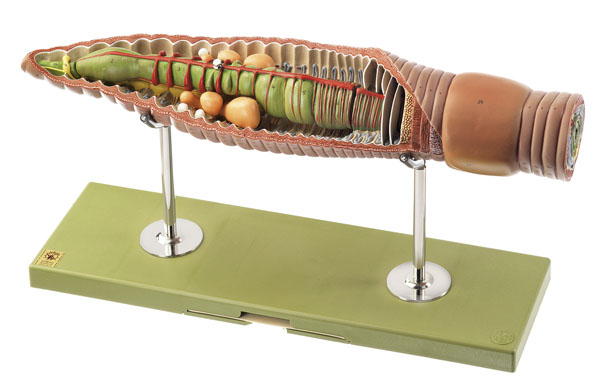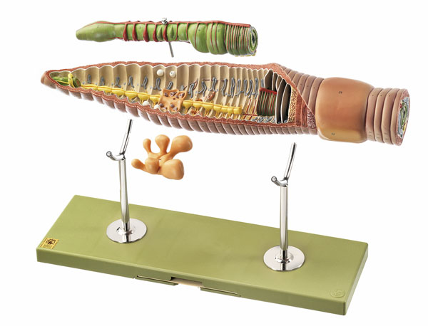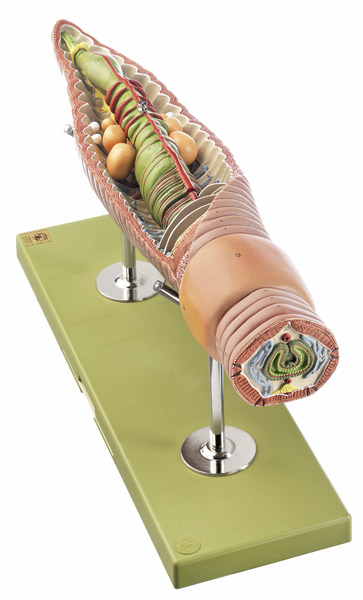 Lumbricus terrestris, enlarged 25 times, in SOMSO-Plast. After Studiendirektor Christian Gross. The model shows the front third of the body with a cross-section in relief. To see the inside of the stomach the intestine can be removed, also revealing the sexual organs. Finally the seminal vesicles are removable to show the testes and sperm ducts. Separates into 3 parts, on a stand with explanatory notes on the base.