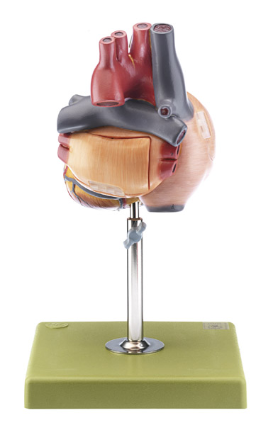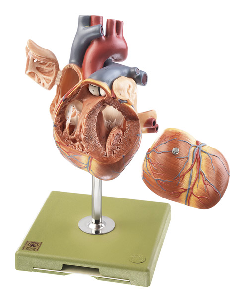 Approximately 1.5 times natural size, in SOMSO-Plast. Sectioned so that both ventricles and atria open to expose the valves. The major blood vessels near the heart and the heart muscles are shown. The impulse excitation and conducting system including the sinoatrial and atrioventricular nodes, the trunk and the atrioventricular bundle are shown. Separates altogether into 4 parts. On a stand with base.