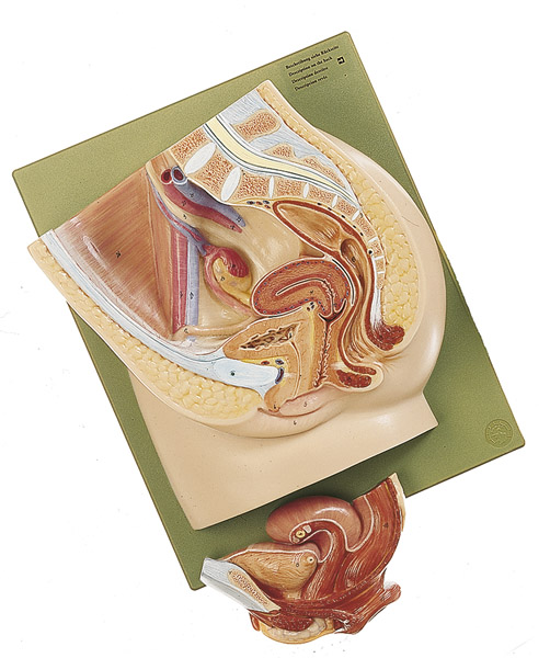 Natural size, in SOMSO-Plast. Female genital organs with bladder and rectum fully exposed and removable. Separates into 2 parts. On a panel.