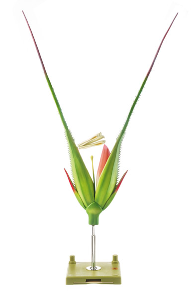 Secale cereale, model enlarged approx. 25 times, made in SOMSO-Plast. After Prof. Dr. W. Jung and Prof. Dr. W. Weber. The separable model (in 4 parts) shows the typical structure of an ear of grass: the outer husk, aristate husk, front husk, swollen body, and hermaphroditic blossom (3 spoon-shaped stamens, nodes with pollen sacs and two feather-shaped stigma). On a stand with base and explanatory note.