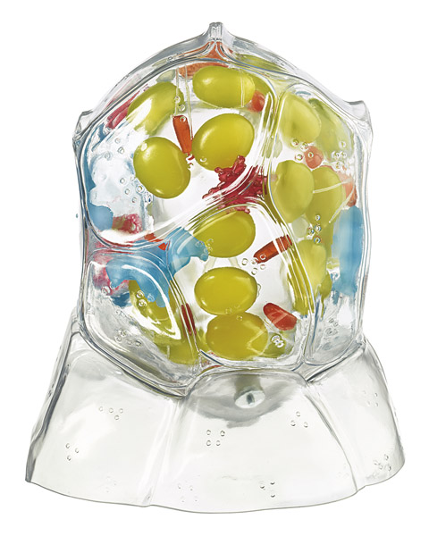 After Prof. W. Weber. Enlarged approx. 6000 times, made of transparent special plastic material. The model provides a slightly schematicized representation of a mature cell from the assimilation tissue of a plant. It combines both light and electron microscopic aspects and shows the cell components for the most part with their electron-optical fine structure. Apart from the layering of the cell wall it shows the configuration of the cytoplasm and the essential cell organs, such as the nucleus, chloroplasts, mitochondria, endoplasmic reticulum, dictyosomes and ribosomes. The use of transparent material gives an insight into the structures behind the section, thus eliminating the need for dismantling the model. The stand is made up of the adjacent cells at the bottom. On a base with description. In one piece.