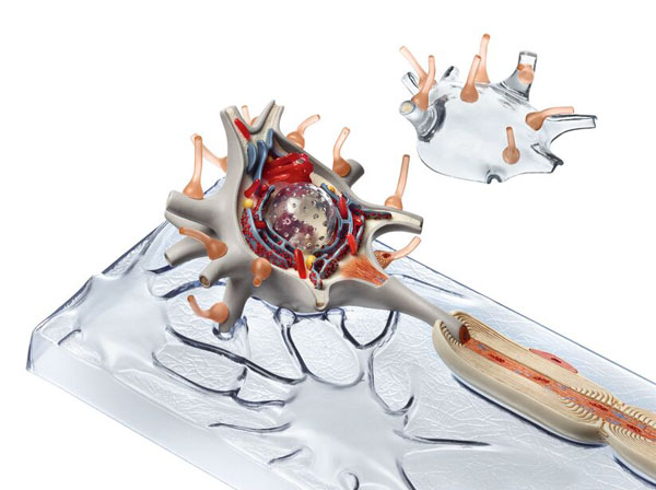 Enlarged approx. 2500 times, in SOMSO-Plast. Consisting of nerve cell body and medullated nerve fibre with structures as revealed by electron microscopy. Separates into 3 parts altogether. Removable from base.