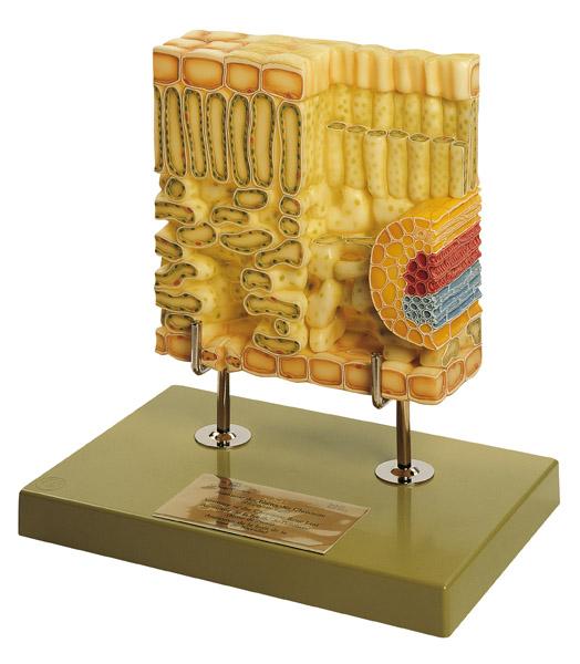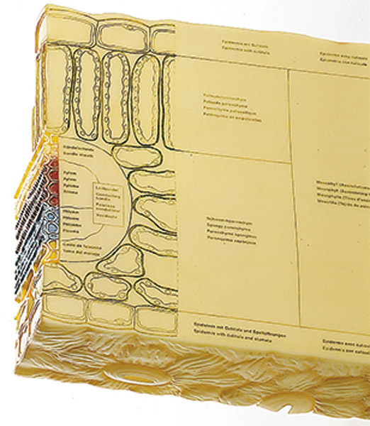 In 700facher Vergrößerung, aus SOMSO-Plast. Nach Prof. Dr. Weber. Das Modell zeigt die obere Epidermis mit Cuticula, das Assimilationsgewebe (aufgegliedert in Palisaden- und Schwammparenchym mit Leitbündel) und die untere Epidermis mit Spaltöffnungen. Unzerlegbar, auf Stativ mit Sockel und Beschreibung.