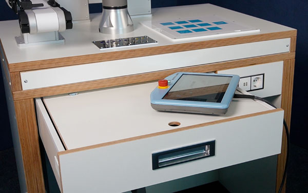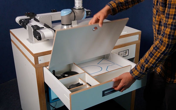 The UR5e Starter training cell offers the ideal introduction to working with collaborative industrial robots (cobots for short). The cobot's extensive safety features enable innovative and safe experimentation in your laboratory. Our system offers a complete solution consisting of a cobot including accessories, as well as a workbench optimized for this application, including power supply, all necessary mounts for the control unit, programming tablet, and cobot, and sufficient storage space for the necessary accessories.