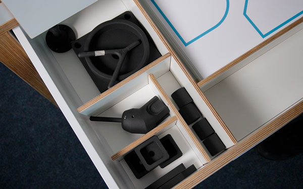 The included work table has two conveyor belts arranged at right angles and a frame for the included practice plates. The design allows for the free creation of additional learning scenarios.