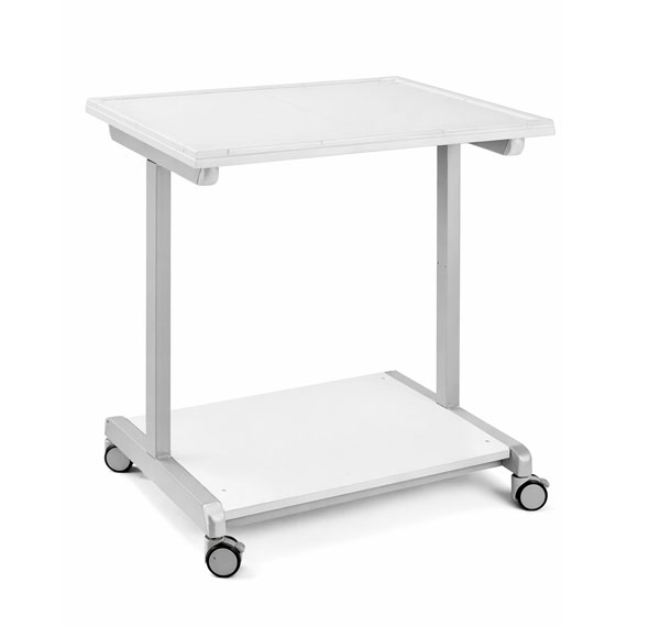 Zum Transport von Geräten und für Versuchsaufbauten mit weißer Fliesentischplatte; Gestell aus Stahlprofilrohr 60 mm x 40 mm x 3 mm, gepulvert dunkelgrau, Unterboden aus kunststoffbeschichteter Spanplatte, 19 mm, 4 Lenkrollen - davon 2 feststellbar.